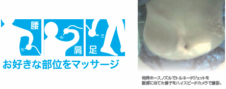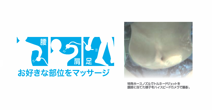 専用の特殊ホースノズルを使用して、身体の気になる部分に直接トルネードジェットをあてる事が可能です。肩こりや腰痛などの疲労部分、お腹まわりや太ももなどシェイプアップしたい部分などに効果的に作用します。